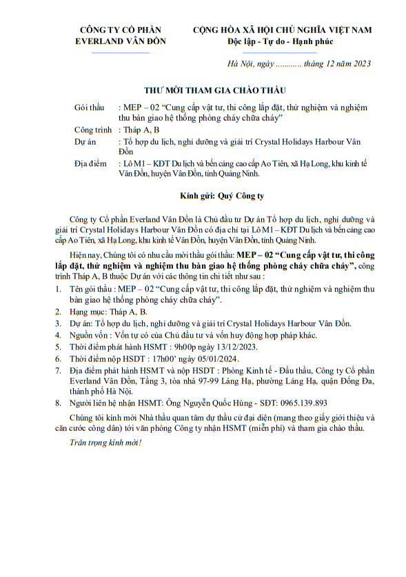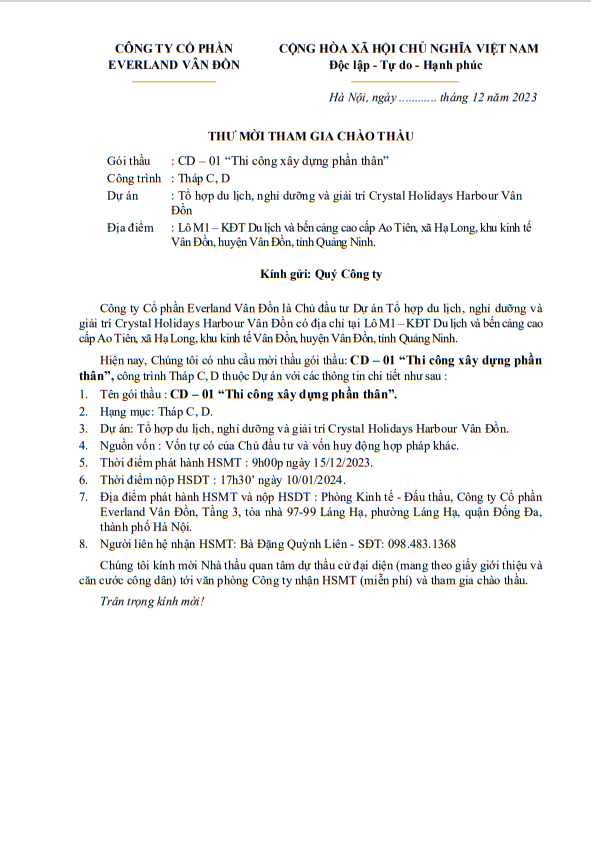 Công ty Cổ phần Everland Vân Đồn là Chủ đầu tư Dự án Tổ hợp du lịch, nghỉ dưỡng và giải trí Crystal Holidays Harbour Vân Đồn có địa chỉ tại Lô M1 – KĐT Du lịch và bến cảng cao cấp Ao Tiên, xã Hạ Long, khu kinh tế Vân Đồn, huyện Vân Đồn, tỉnh Quảng Ninh.