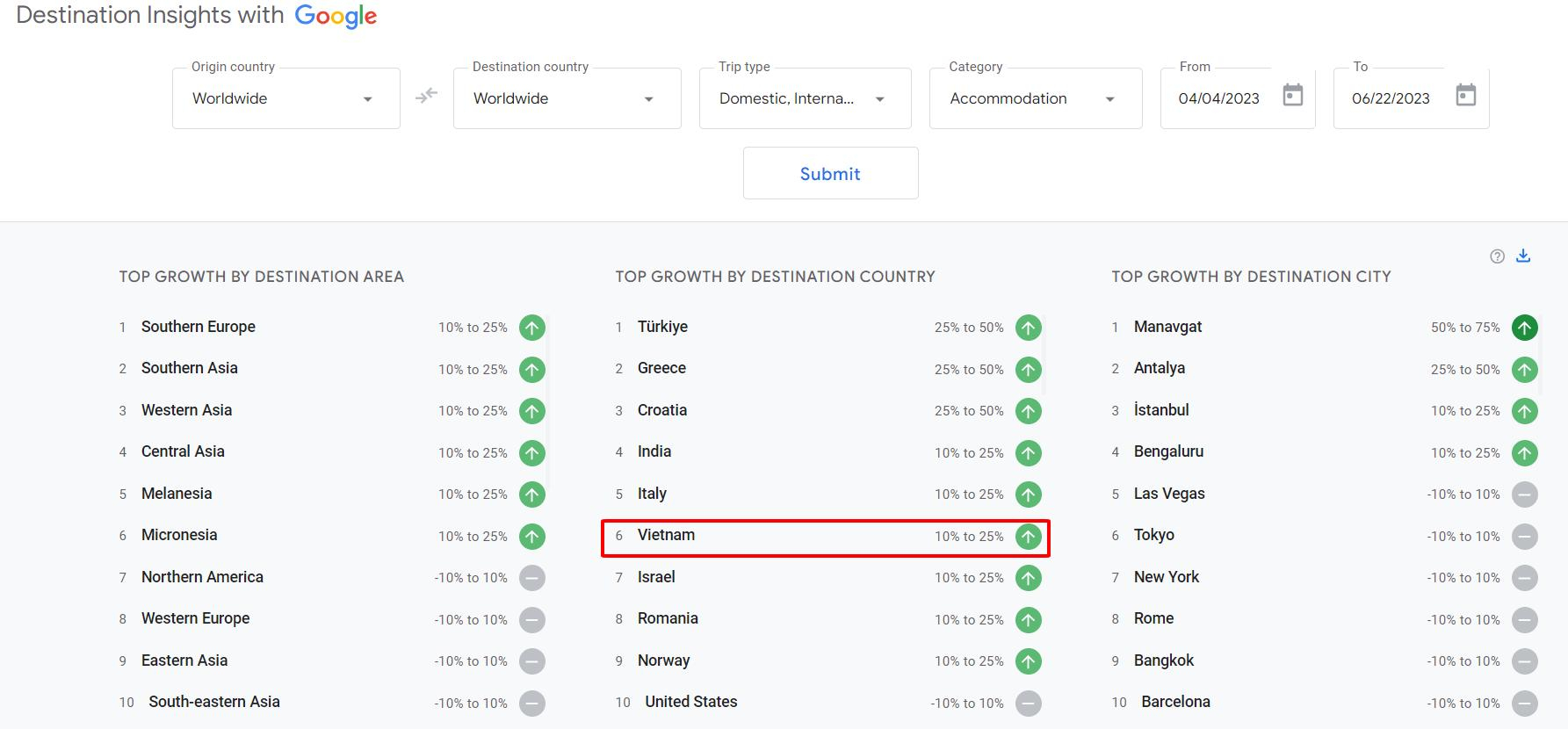 Từ đầu năm 2023 tới nay, lượng tìm kiếm về du lịch Việt Nam liên tục tăng trong tốp đầu thế giới, từ vị trí thứ 11 lên vị trí thứ 6 hiện nay, theo dữ liệu từ công cụ theo dõi xu hướng du lịch của Google. Việt Nam là điểm đến duy nhất trong Đông Nam Á nằm ở nhóm này.